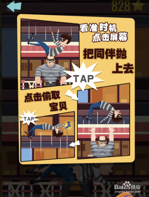 点击进入后,页面会提醒故事模式的弄法。需要点击屏幕,然后看准机会,盗取宝物。