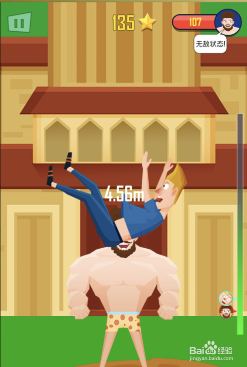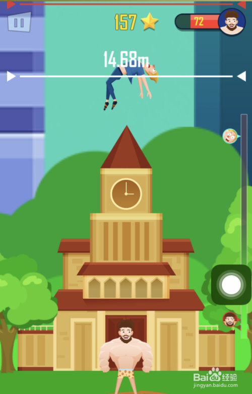 抛出人物会飞到空中,人物抛得越高得分就越高。抛出人物后在将要落地时再次点击屏幕,可以将游戏人物再次抛出。累计抛出的越高,得分就越高。