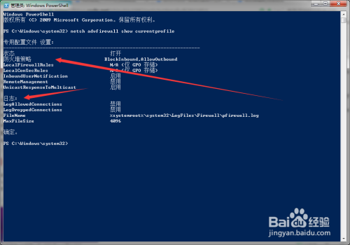 在返回指令中,我们可以查看防火墙策略、防火墙日记状况等信息。