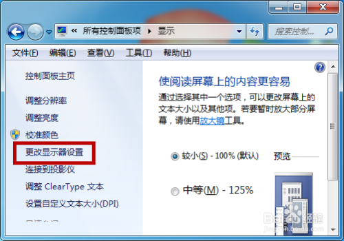 点击后会打开显示设置界面,在左侧的菜单中找到并点击打开【更改显示器设置】。