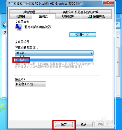 点击之后会呈现两个选项,这里把它选择为【60赫兹】,选择好后点击【确定】,这样就解决了这个问题。