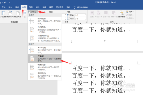 接着我们找到需要朋分的一页,在上方择页面结构,然后点击插入一个持续分隔符即可。