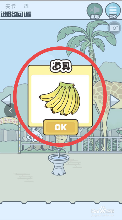 长颈鹿的头被点击之后就会低下头去喝水,然后就会将头后面盖住的工具漏出了来了,可以看见这是一串喷鼻蕉。点击喷鼻蕉,收成喷鼻蕉。