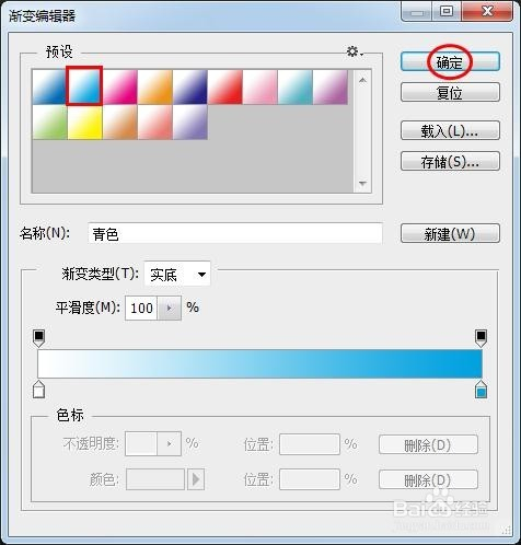 第七步:鼠标左键单击上方渐变图标,在“渐变编纂器”中选择渐变蓝色。