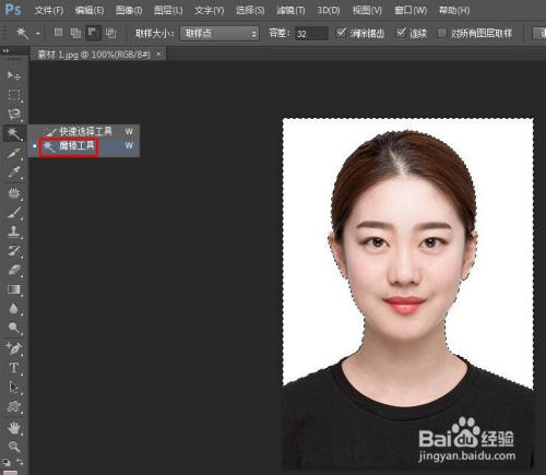 第二步:在左侧东西栏中选择“魔棒东西”,选中图片中的白色布景区域。
