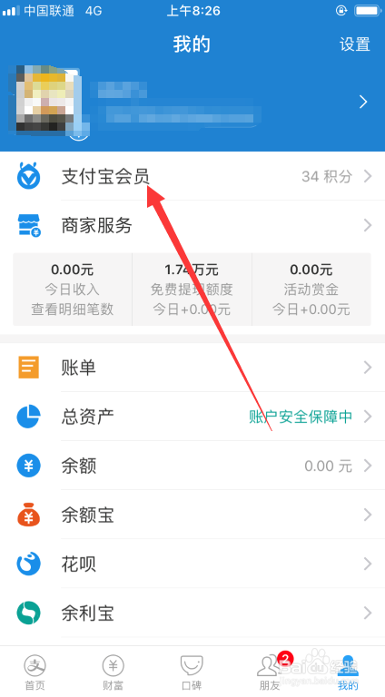 进入我的页面后,如下图红标位置所示,点击页面中的支付宝会员进口进入。