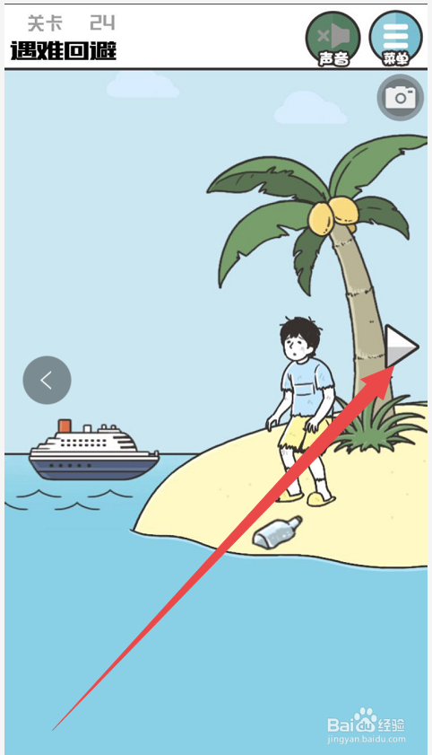 进入到具体的挑战页面之后,可以看见游戏人物今朝正处在一个孤岛上面,这个页面内有良多的工具可以点击,可是对于挑战没有效处,直接点击页面右侧的箭头,显示右侧的页面。