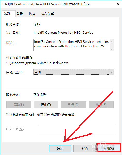 此时再双击Intel(R) Content Protection HECI Service打开该对话框属性中在办事状选项设置中单击启动按钮。