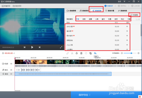 若是在音乐的播放过程中增添一些音效,可以点击添加音效——可以选择本身建造好的音效,那就选择当地音效,也可以选择快剪辑中的一些音效。