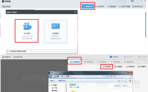 打开快剪辑——点击新建视频——选择专业模式——添加剪辑——当地视频——把要进行编纂并配乐的视频添加到编纂页面那边。