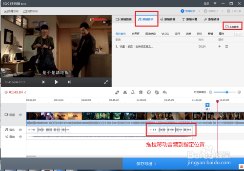 值得注重的是若是要给视频添加的音乐有好几个,还可以继续添加当地音乐,可以对音乐的位置进行拖沓来移动,放置在响应视频的合适位置。