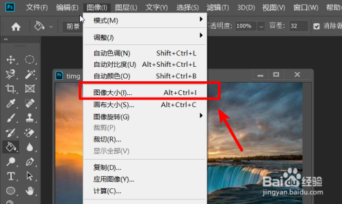 点击后,鄙人方弹出的窗口中,选择图像大小的选项。也可以利用快捷键ALT+CTRL+I快捷操作。