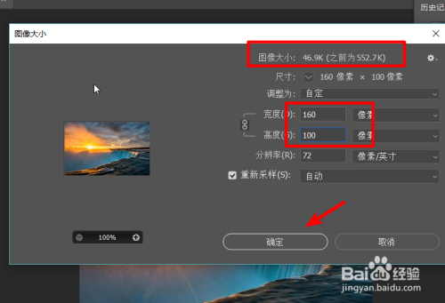 在图像大小界面,可以设置图像的宽度和高度以及分辩率等,设置完毕后点击确定。