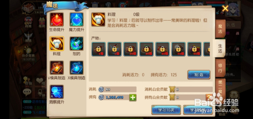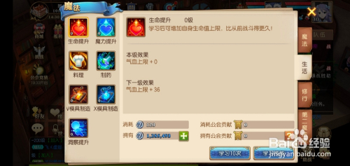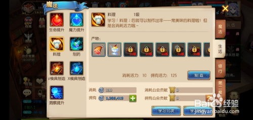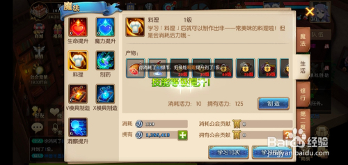 摒挡的页面,点击下方的进修技术,需要耗损银币和公会进献。