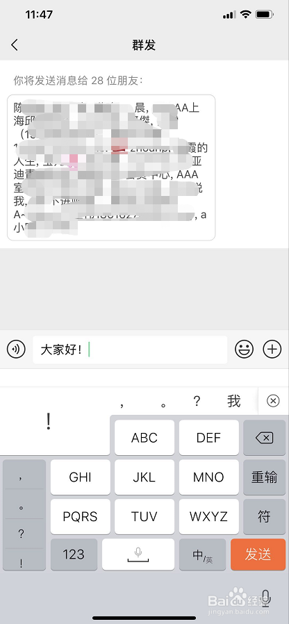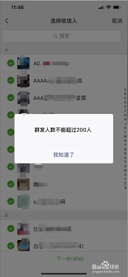 选择收信人,注重单次群发上限人数不克不及跨越200人;
