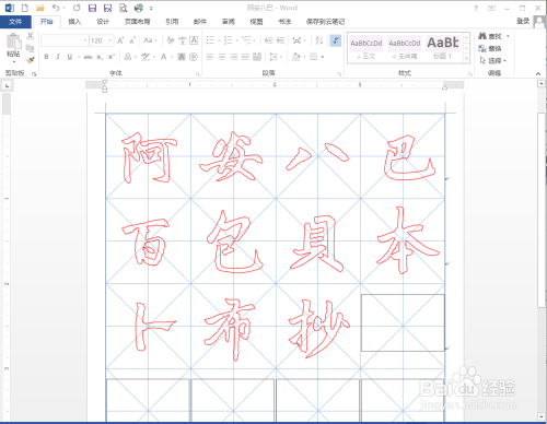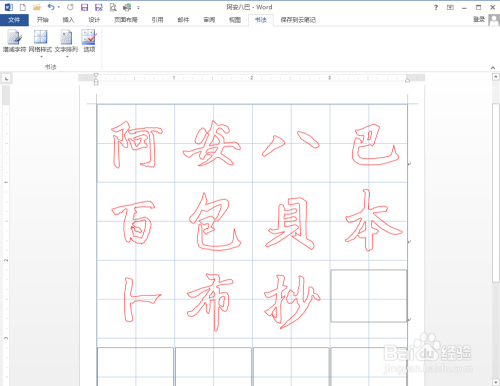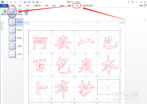 利用Word 2013建造字帖,默认网格是米字格。切换“书法”选项卡,点击“书法”区域中的“网格样式”,可以经由过程下拉菜单中的选项进行更改为田字格、田回格、九宫格或口字格等样式。如图所示,