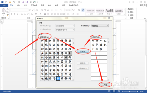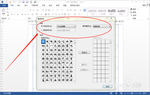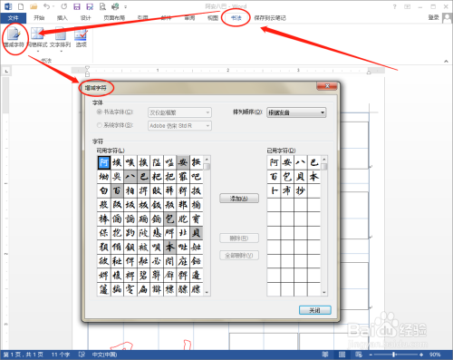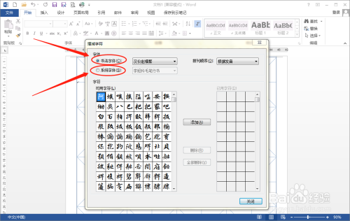 之后Word 2013就会建立一个书法字帖的文档,并弹出“增减字符”对话框。