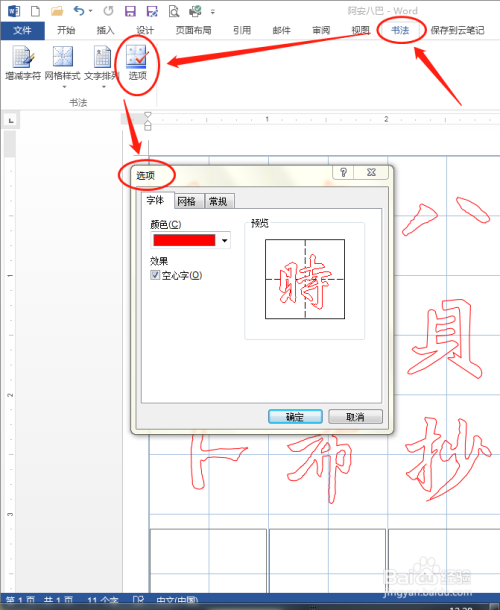 切换“书法”选项卡,点击“书法”区域中的“选项”,在弹出来的“选项”对话框中可以对“字体”“网格”“常规”等方面进行设置。