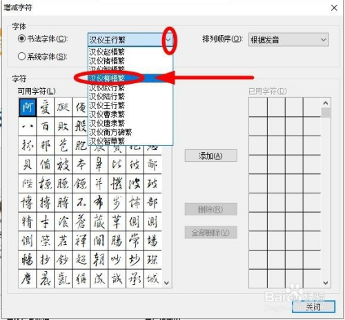 在弹出的“增减字符”对话框中的“字体”选项组中,单击“书法字体”后面的下拉箭头,鄙人拉菜单中选择心仪的字体单击