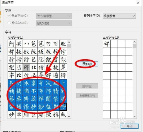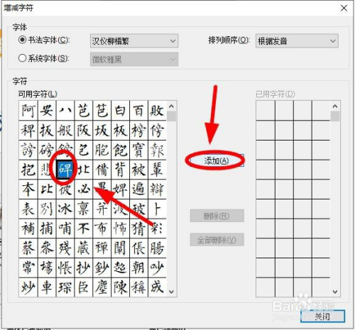 在“字符”下面选中要利用的书法字符,单击“添加”