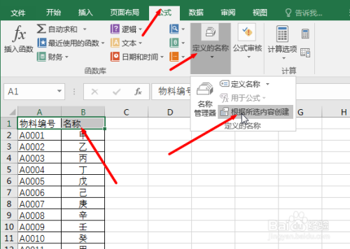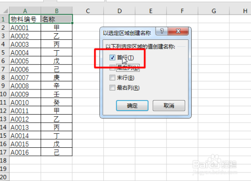 接着选择这个工作表的内容,然后点击【数据-界说的名称-按照所选内容建立】,打开以选定区域建立名称,然后选择【首行】
