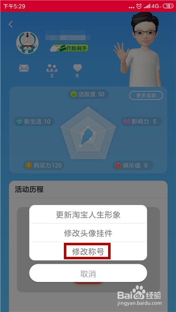 打开淘宝人生,在顶部我们昵称后方显示的就是称号,想要点窜的话需要点击头像。