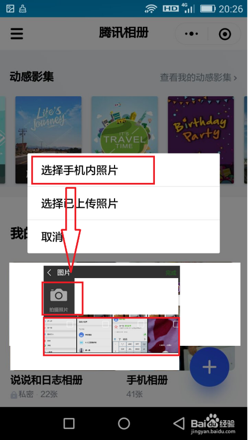 点击影集类型后,就会呈现选择手机内照片或者选择已上传照片,在这里点击选择手机内照片——然后选择手机内要建造小视频的照片(也可以点击摄影,拍一些照片),起码要选择3张以上——点击完当作