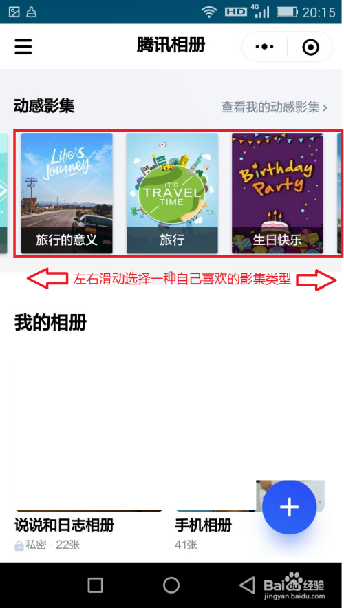 打开腾讯相册之后,在最上面有一个动感影集分类,摆布滑动选择一种本身喜好的影集类型。