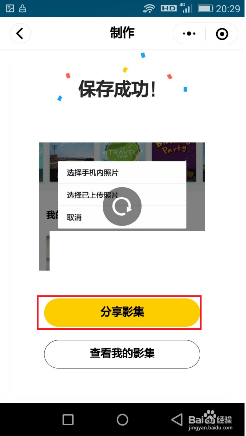 最后,会是播放照片影集视频动画,点击保留就会显示保留当作功——点击分享影集就可分享到微信群或老友那边了。