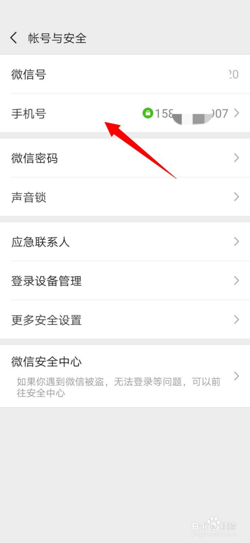 如图:在“账号与平安”界面,点击“手机号”;
