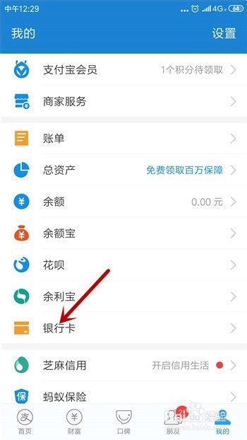 在本身的支付宝小我中间里面点击打开【银行卡】。