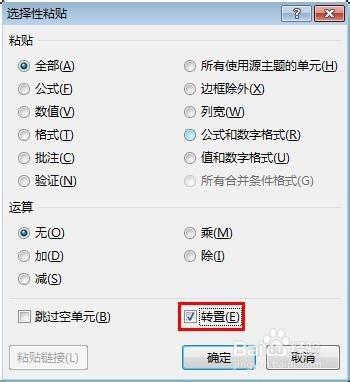 第五步:在“选择性粘贴”对话框中,勾选上“转置”,单击“确定”按钮。
