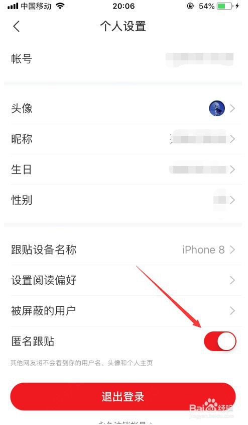 进入账号设置之后,就可以看到“匿名跟帖”的设置选项,后面的按钮默认是封闭状况,如图所示。