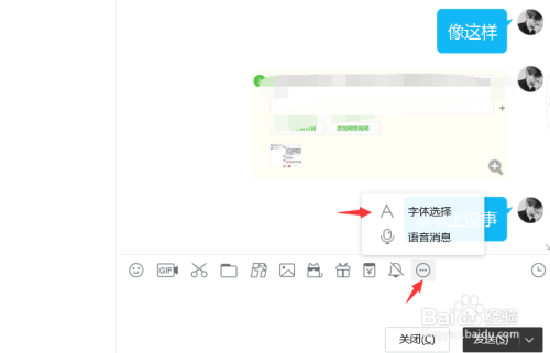 第四步就是点击对话框聊天输入窗口右边的一个圆圈和三个黑点那个图标,然后在弹出来的菜单中选择字体选择这个选项: