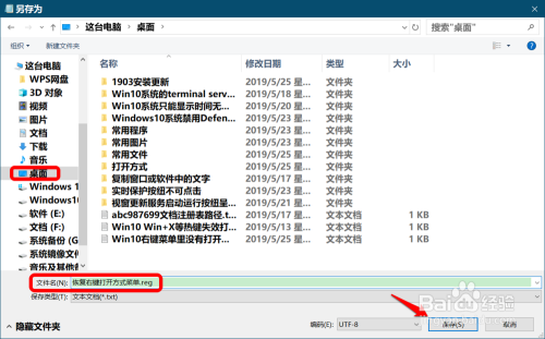 在另存为窗口中,先点击窗口左侧的【桌面】,在文件名(N)栏中输入:恢复右键打开体例菜单.reg,再点击:保留;