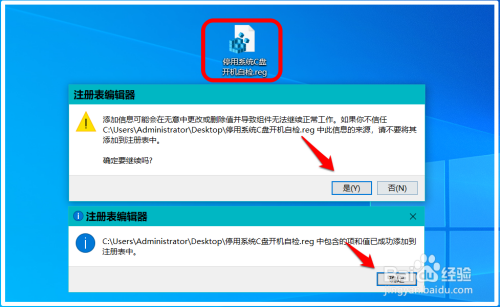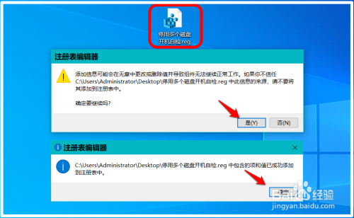 在系统桌面上找到并左键双击【禁用开机自检磁盘.reg】注册表文件图标,在先后弹出的注册表编纂器对话框中点击:是(Y)和确定。