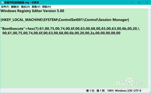 按照建造【禁用开机自检磁盘.reg】注册表文件的方式建造一个【恢复开机自检磁盘.reg】注册表文件添加到注册表中。