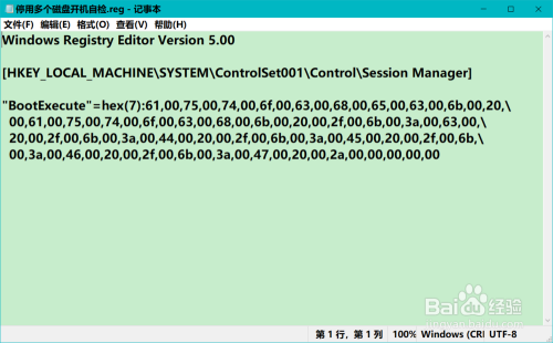 按照建造【禁用开机自检磁盘.reg】注册表文件的方式建造一个【停用系统C盘开机自检.reg】注册表文件添加到注册表中。