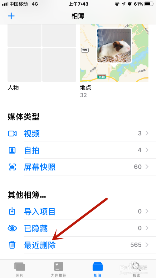 接着回到相册界面,然后下拉到最低端,可以看到【比来删除】的图片
