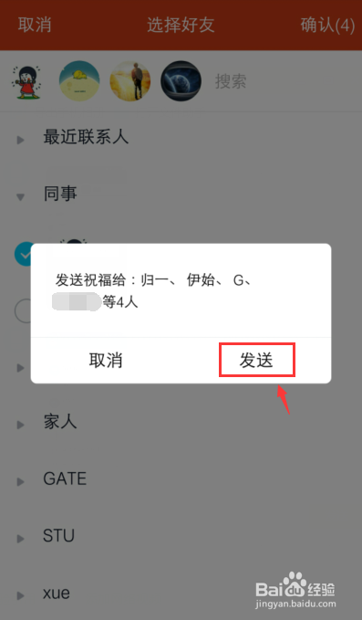 呈现对话框,确认群发的QQ老友,点击【发送】。