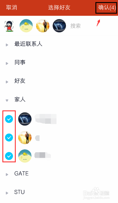 进入选择老友页面,选摘要群发的人,再点击右上角的【确认】。