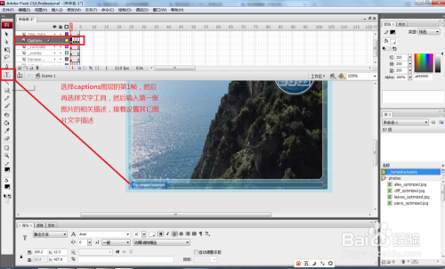 第六,选择captions图层的第1帧,然后再选择文字东西,然后输入第一张图片的相关描述,用同样方式设置其它相片的相关描述文字并设置好文字。