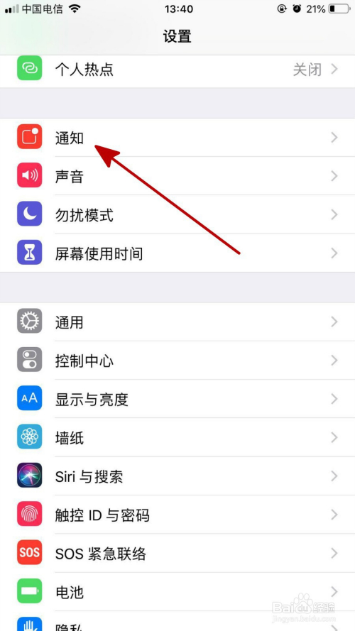 接着点击手机桌面“设置”,并选择“通知”打开,如下图
