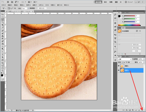 打开Photoshop CS5软件,将我们找好的饼干原图片拉进ps作图区域。双击布景图层,将布景图层转换为通俗图层后,点击【多边形套索东西】框选出我们需要的部门后,同时按下【Ctrl】+【J】进行图层复制并删除原图层(如图所示);