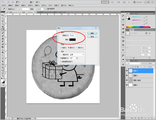 点击【新建图层】图标,新建一个图层后,点击【椭圆选框东西】绘制一个圆形选框。点击【编纂】-【描边】,按图示设置好描边的各个参数绘制出一个圆框图案(如图所示);