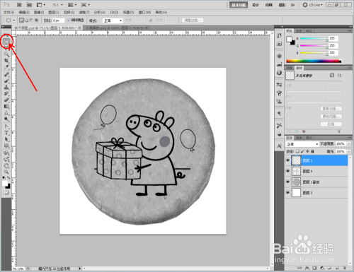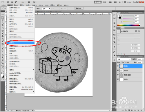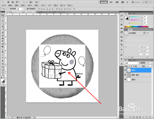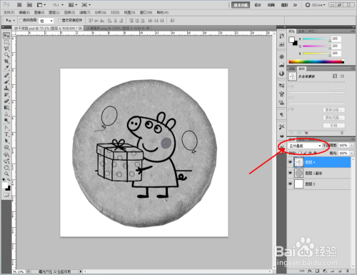 点击【图像】-【调整】-【去色】,将彩色图转换为口角图。将找好的卡通猪口角图拉进作图区域,并将模式更改为【正片叠底】(如图所示);