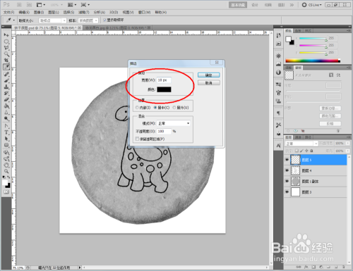 点击【新建图层】图标,新建一个图层后,点击【椭圆选框东西】绘制一个圆形选框。点击【编纂】-【描边】,按图示设置好描边的各个参数绘制出一个圆框图案(如图所示);
