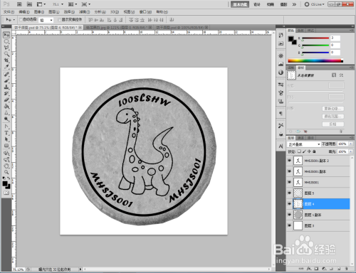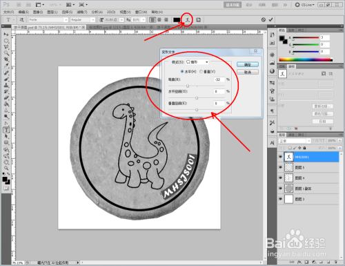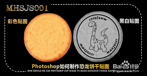 点击【文字东西】,输入文本内容:MHSJS001并进行文字变形。完当作后,将文字进行扭转复制。调整好各图层的位置关系后,将图片存储为jpg格局,这样我们的恐龙饼干贴图便全数建造完当作了。