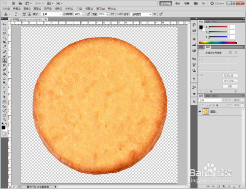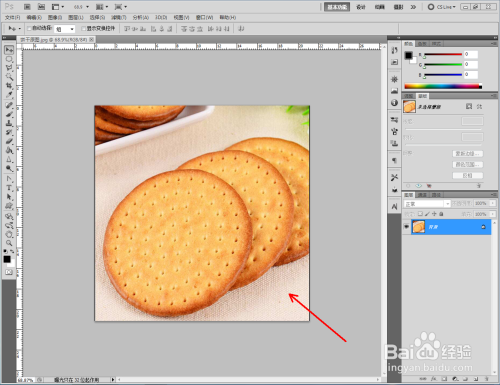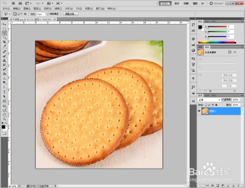 打开Photoshop CS5软件,将我们找好的饼干原图片拉进ps作图区域。双击布景图层,将布景图层转换为通俗图层后,点击【多边形套索东西】框选出我们需要的部门后,同时按下【Ctrl】+【J】进行图层复制并删除原图层(如图所示);
