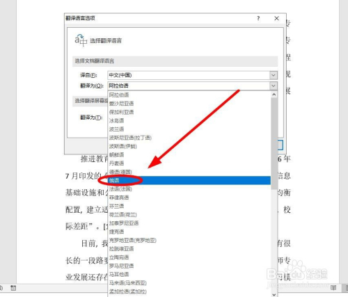 在弹出的“翻译说话选项”对话框,我们要进行翻译来历和目标的设置,单击“源自”后面的下拉箭头,选择本来的说话类型,默认是中文(中国),这里就不消再从头设置。单击“翻译为”后面的下拉箭头,选摘要把此刻的中文翻译当作哪一种说话,我们鄙人拉菜单中选择目标说话“俄语”